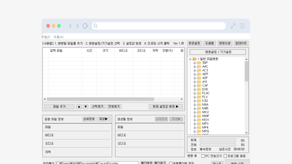 간편한 사용방법복잡한 프로그램 없이 카카오인코더 하나로 다양한 영상 변환 작업을 할 수 있습니다.몇 번의 클릭만으로 동영상 인코딩을 빠르게 완료할 수 있습니다.다양한 해상도 설정과 여러 포맷 변환을 지원합니다.