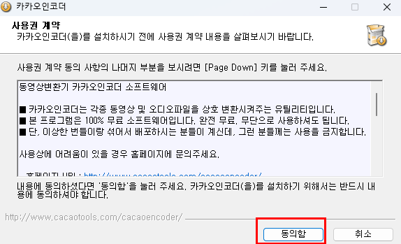 카카오인코더 설치 파일을 다운로드한 후 실행하고 다음 >을 클릭합니다.